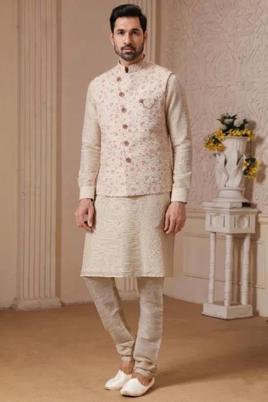 Cream Jacket Style Art Silk Straight Cut Men Kurta Pajama